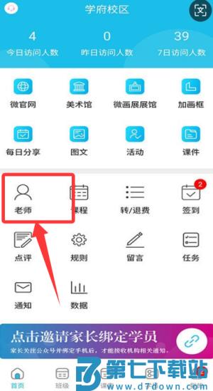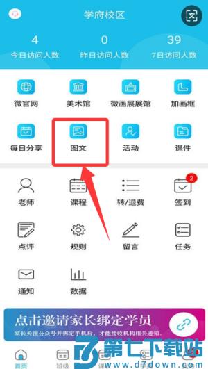 1、家长登录后进入主页,点击课程表或通知栏,就能查看老师发布的最新课程安排和校园动态。