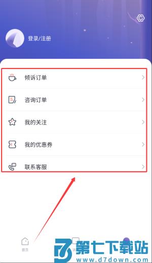 4、个人中心设有倾诉记录查询、咨询订单管理、关注列表维护及专属客服通道等功能入口。