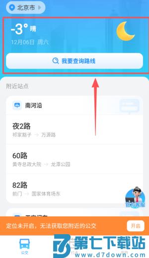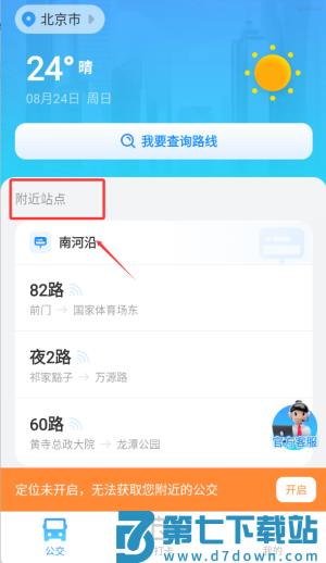 1、打开app后先开启定位权限,系统会自动显示你附近的公交站点和线路信息,还能看到最近车辆的预计到达时间。