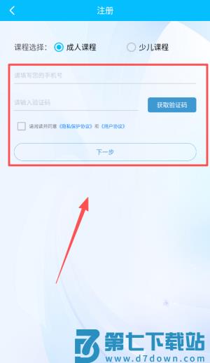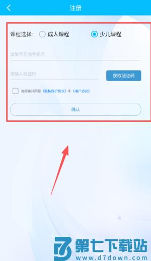 2、注册先选课程类型如成人或少儿,填手机号收验证码,同意协议才能继续。