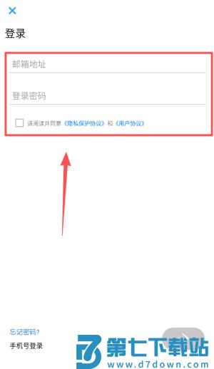 1、登录先输邮箱与密码,勾选协议框,忘记密码可选手机号登录找回。