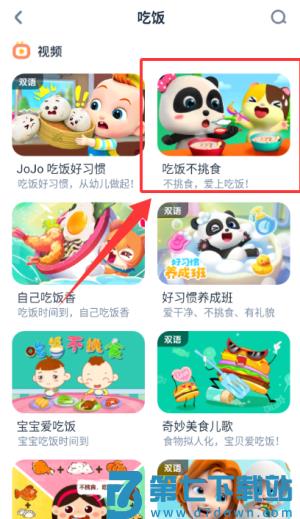 4、进入吃饭分类页,可选择如吃饭不挑食等视频观看儿歌。