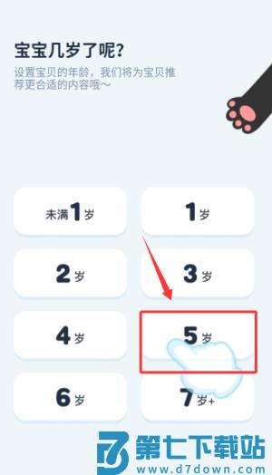 2、在该页选择对应宝宝年龄例如五岁,完成设置后进入主界面。
