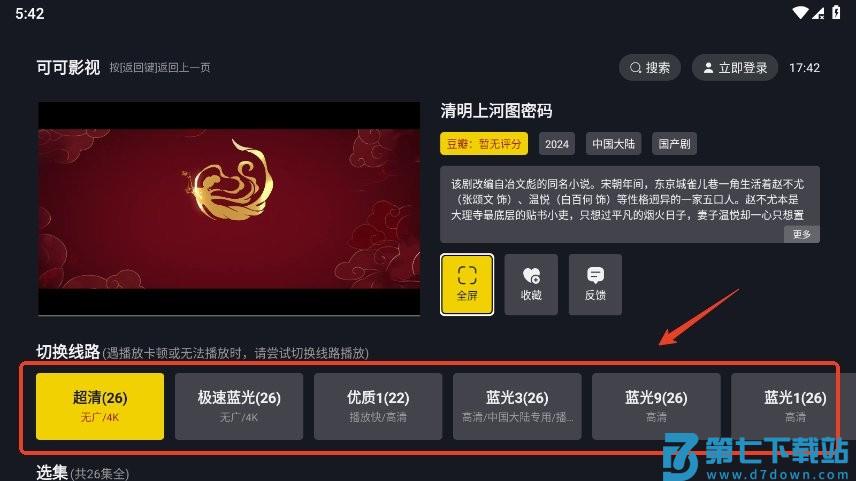 播放时卡顿,可以点击底部的切换线路,拥有多个蓝光超高清线路可选。