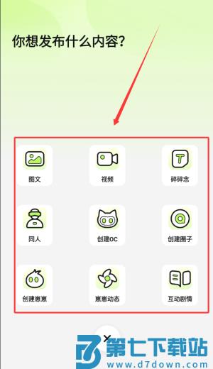4、点击加号可发布图文、短视频、心情记录,或创建个人圈子与虚拟崽崽。