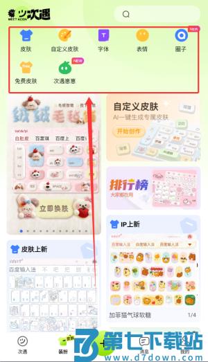 3、装扮板块提供主题皮肤、自定义设计、字体、表情包及免费皮肤选择。