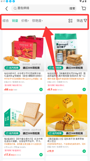 2、在分类栏选择面包烘焙标签,浏览对应商品列表。