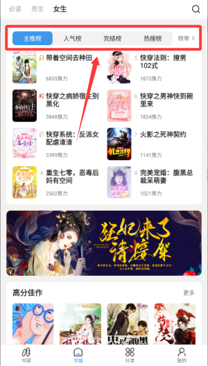 3、多维度榜单辅助筛选:设有高分、新书、热度、热搜等多类榜单,并区分男频、女频,方便用户快速发现优质作品。
