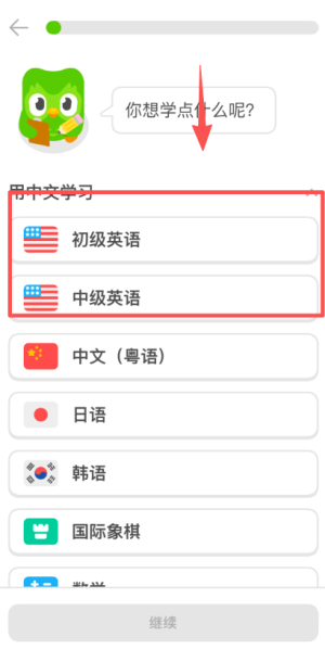 1、安装应用后启动程序,根据界面引导选择一门感兴趣的目标语言,例如英语或日语,作为学习起点。