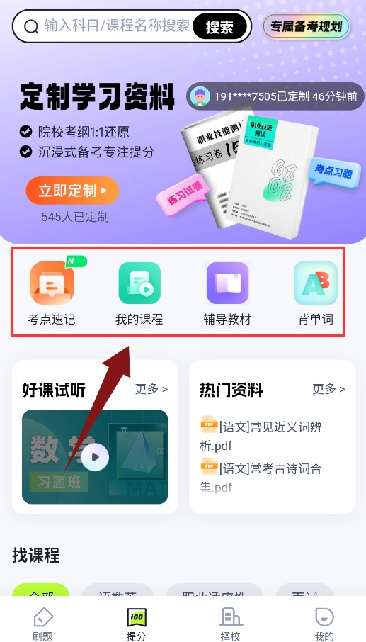 3、提分界面设有考点速记、我的课程、辅导教材与词汇背诵。