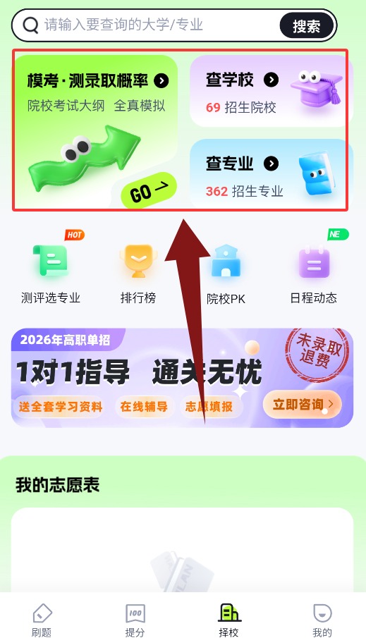 4、择校界面支持模拟考试、院校查询与专业信息检索功能。