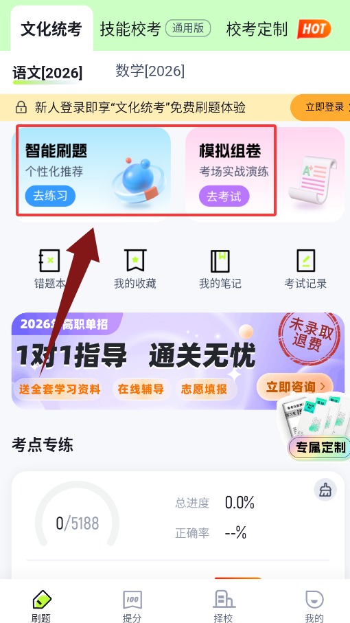 2、刷题界面提供智能刷题与模拟组卷两种核心练习模式。