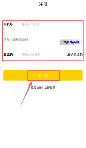 2、在注册页填写手机号与图形验证码,获取短信验证码填入后点击下一步。