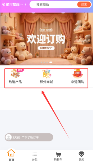 3、首页提供热销产品榜单、积分兑换商城及幸运团购活动等多个购物入口。