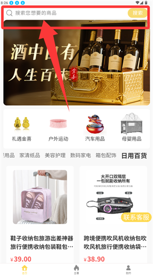 2、在首页顶部搜索框中,输入商品名称即可进行查找。