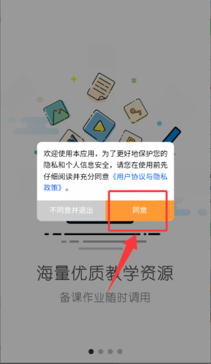 1、启动程序后查阅用户协议及隐私政策,点击同意按钮进入功能引导页。