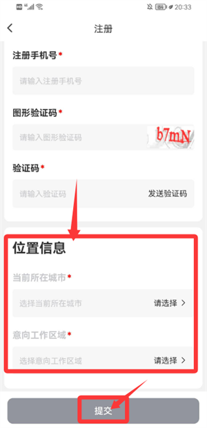 4、补充所在城市与工作区域,点击提交完成注册流程。