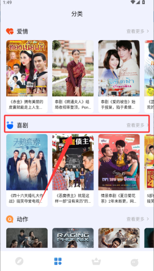2、选择中间的喜剧分类进入查看更多。