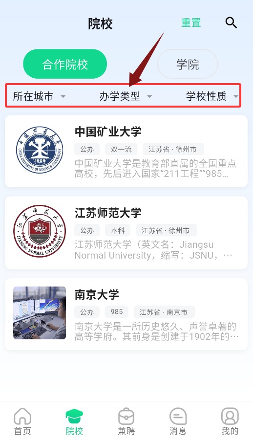 3、院校界面可按所在城市、办学类型、学校性质等条件筛选。