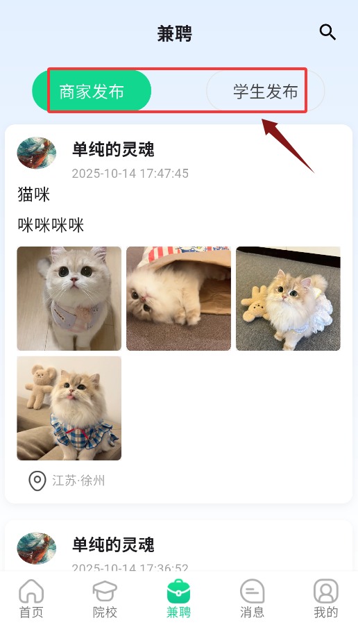 4、兼聘界面展示商家发布与学生发布两类兼职招聘信息。