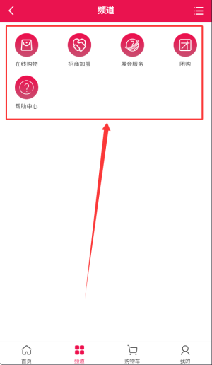3、在频道板块中可以浏览在线购物专区、招商加盟信息、展会服务预约、团购活动参与及帮助中心入口。