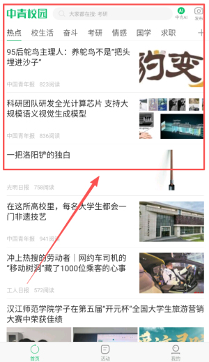 1、打开中青校园应用,首页展示各类新闻与活动信息,用户能够快速找到自己感兴趣的内容,提升查找效率。