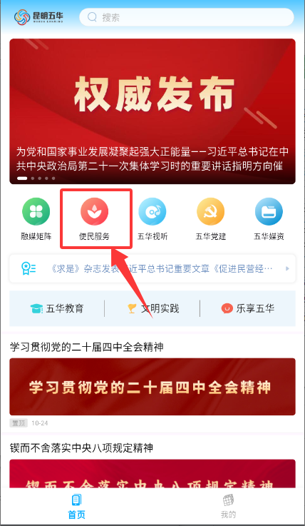 3、进入首页后找到便民服务选项,点击进入对应的服务功能页面。