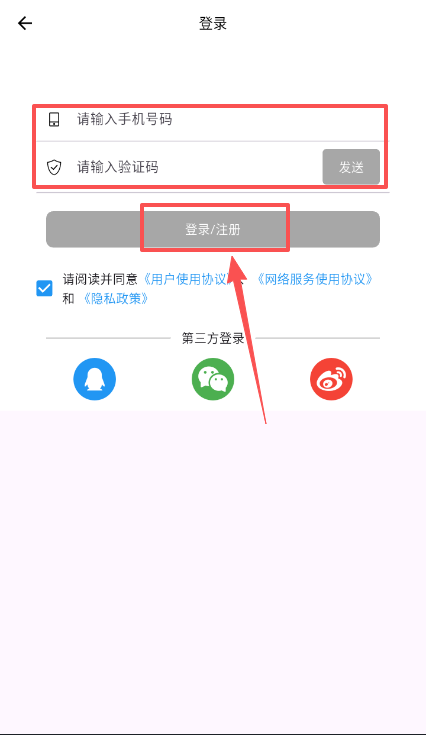 2、在登录页填写手机号并输入验证码,点击登录或注册完成操作。