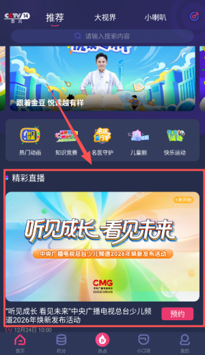 1、下载后打开应用,在首页醒目位置能找到直播入口,点击即可实时观看央视少儿频道的精彩节目。