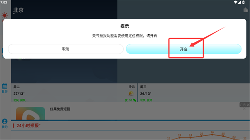 1、启动天气应用后,请允许开启定位权限以获取本地天气预报服务。