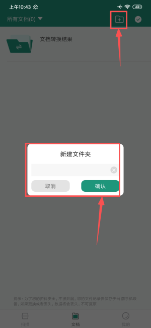 3、于文档管理区点击新建文件夹图标,输入名称确认即可完成创建。