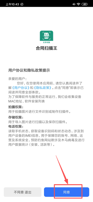 1、打开软件后查看用户协议与隐私提示,点击界面同意按钮进入下一步。