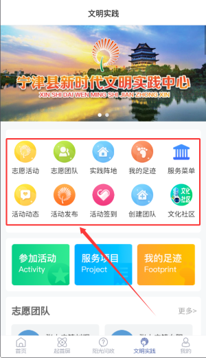 4、文明实践栏目包含志愿活动报名、团队信息查询、实践阵地浏览、足迹记录、服务菜单查看、活动动态及发布功能。