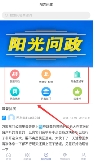 3、阳光问政板块提供我要问政提交、物业直通车服务、营商环境反馈、部门问政及红黄榜公示功能。