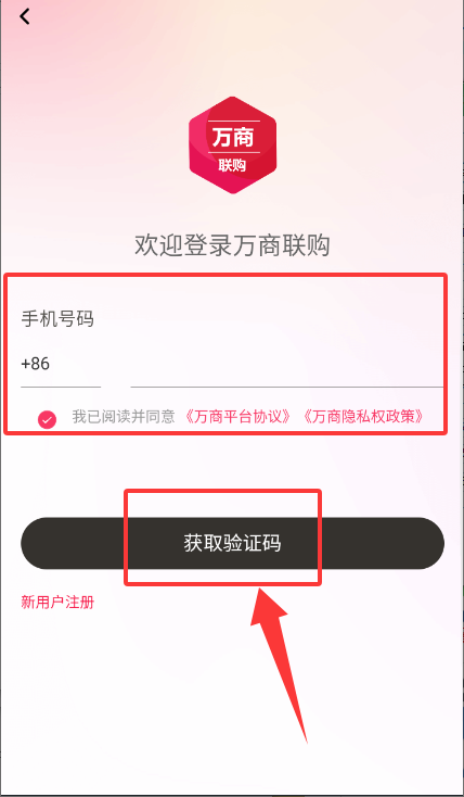 2、在登录页填写手机号并勾选协议,点击获取验证码获取登录信息。