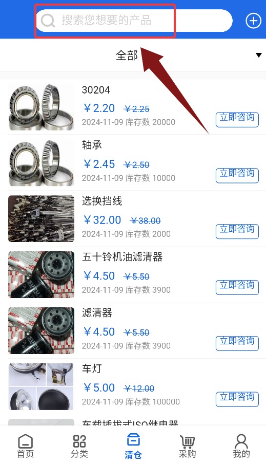 4、清仓界面提供搜索栏,可输入关键词查找目标促销产品。