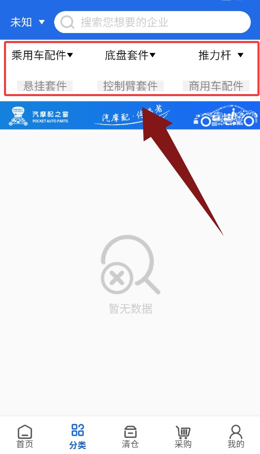 3、分类界面可按乘车用配件、底盘配件、推力杆等类别筛选。