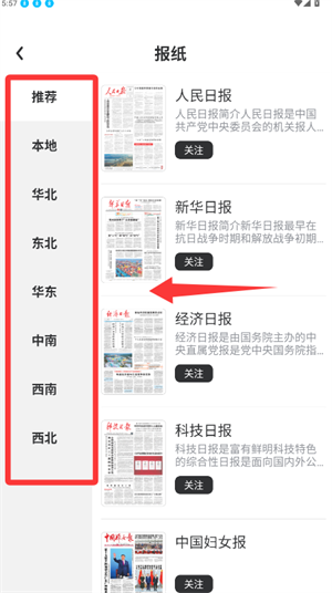 2、切换至报纸页面,按区域分类找到经济日报并点击。