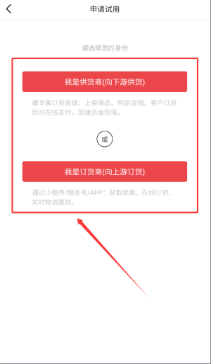 3、若无现有账户,可选择申请使用入口,并根据身份选择供货商或订货商。