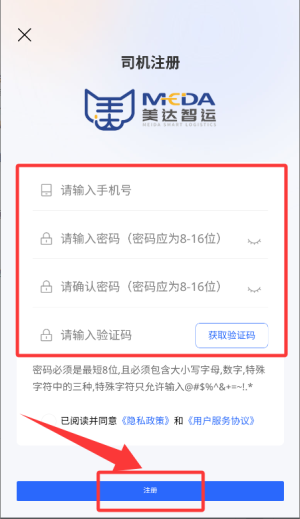 3、于注册页填写手机号码、设置密码并获取验证码,勾选协议后点击注册。