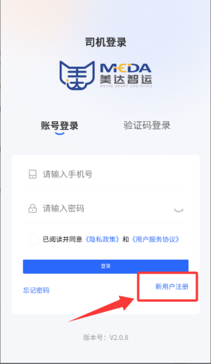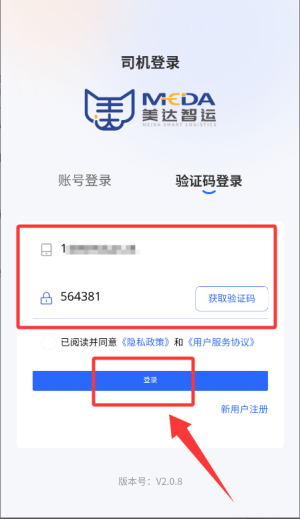 1、于美达智慧物流的隐私弹窗点击同意,确认条款后进入司机登录主界面。