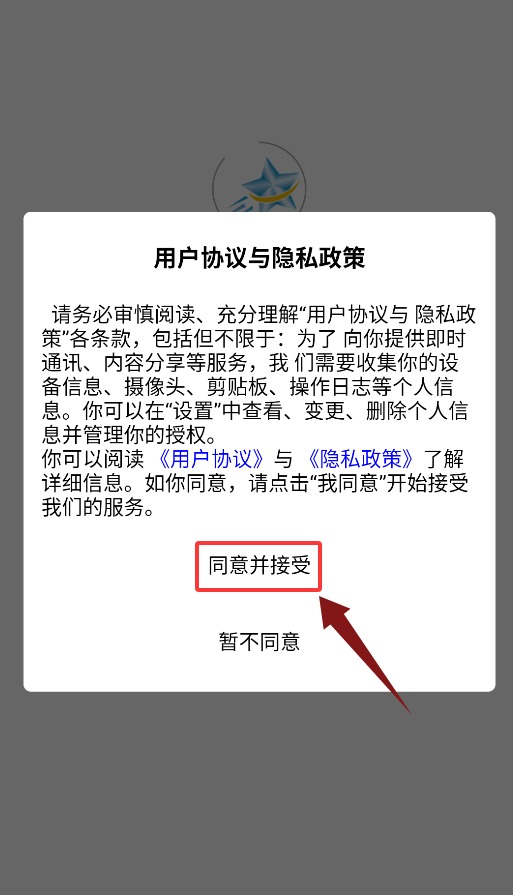 1、首次启动应用需点击同意并接受,确认后方可进入主界面。