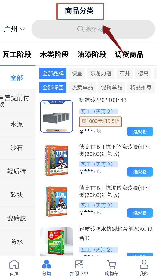 3、分类界面支持按商品类别筛选,快速定位目标材料。