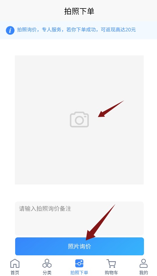 4、拍照界面可上传现场照片,填写备注后发起在线询价。