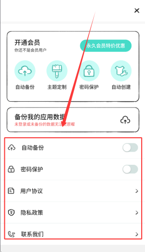 4、个人设置模块集成数据自动备份、密码保护功能、用户协议与隐私政策查阅以及官方联系渠道等管理选项。