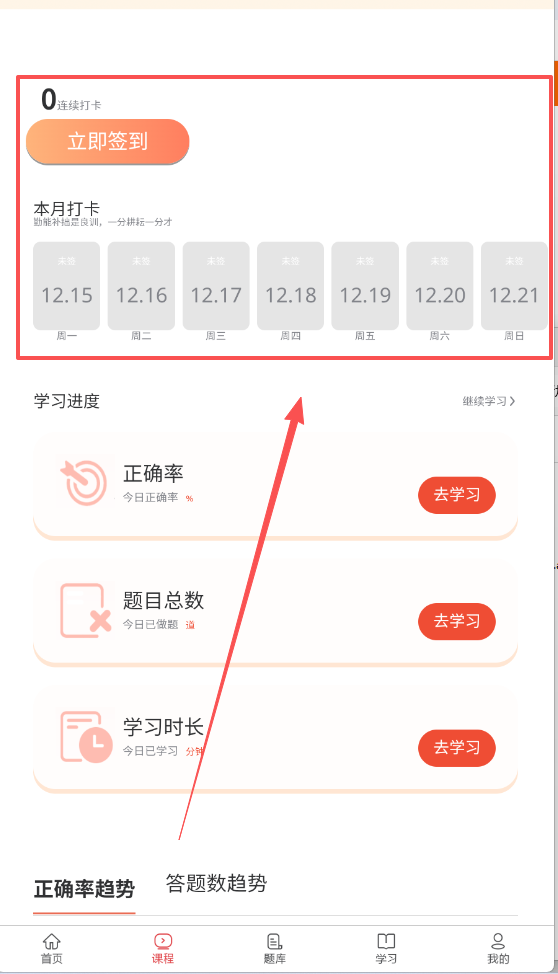 2、可以在课程内打开自己的学习进度,查看自己的学习进度和正确率等信息。