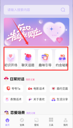 4、辅助工具与素材库,提供“情侣头像”等视觉素材库及“日常话术”等高频用语集合,作为聊天过程中的实用辅助工具。