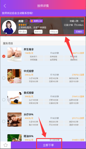 3、在技师详情页确认服务项目,点击立即下单发起服务预约。