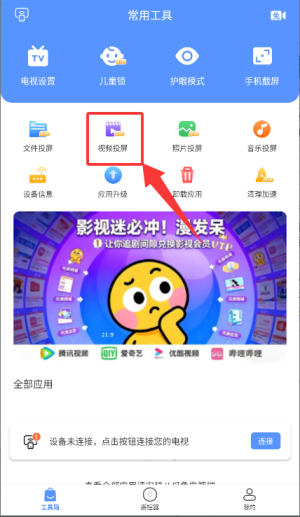 3、在工具箱页面找到视频投屏选项,点击即可启用该功能。