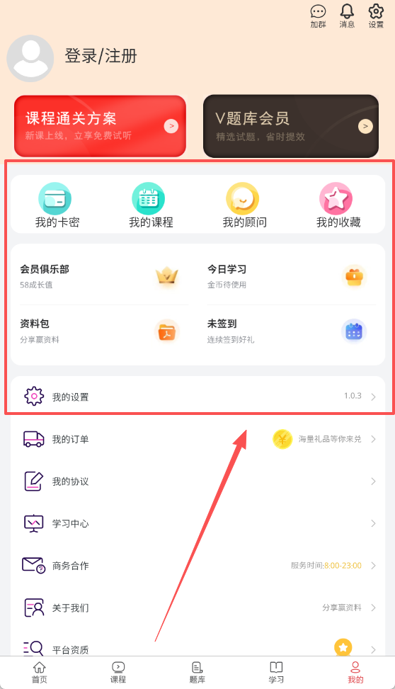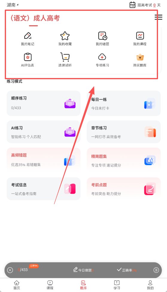 3、可以在题库内学习不同的课程,也可以查看自己的笔记收藏等信息。